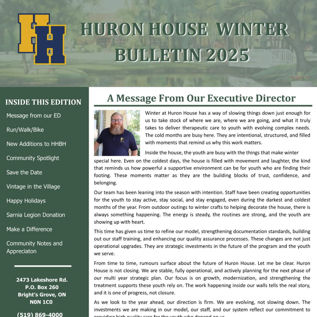 Our Winter Bulletin is here! This season, we’re sharing stories of growth, achievements, and the everyday moments that make life at Huron House Boys’ Home so special. From recent activities to upcoming events, this edition highlights the impact our supporters and community partners have on the boys’ lives.
